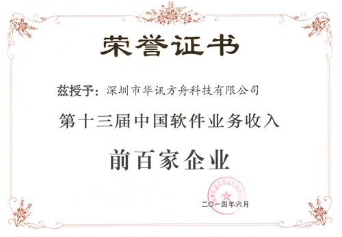 工業(yè)和信息化部運(yùn)行監(jiān)測(cè)協(xié)調(diào)局6月12日在青島市發(fā)布了2014年(第十三屆)中國(guó)軟件業(yè)務(wù)收入前百家企業(yè)(簡(jiǎn)稱(chēng)軟件百家)名單,華訊方舟集團(tuán)入選2014年中國(guó)軟件收入百?gòu)?qiáng),排名55位。